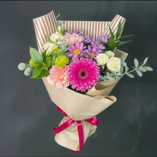 "Монами" сочетает в себе изысканность и нежность природы. Кустовые розы, хризантемы, герберы и гвоздики создают гармоничное сочетание форм и текстур. Фиолетовые и розовые оттенки цветов сияют из-под его креативной упаковки, будто приглашая в путешествие в страну мечтаний. Этот букет олицетворяет тепло и романтику, заполняя воздух ароматом нежности.