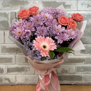 Изящные розы, нежные хризантемы и причудливые герберы сплетаются в завораживающую гармонию цветов и ароматов. Каждый цветок в букете становится яркой ноткой в безымянной музыкальной композиции, которая доставит радость и восхищение вашему избраннику. Упаковка великолепно подчеркивает красоту букета, окутывая его загадочным волшебством. Подарите "Радость мгновений" и создайте незабываемый момент в жизни своих близких.